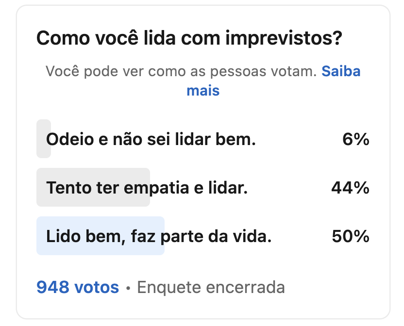 Como vocês podem ver, em comum entre 94% das pessoas, sabemos que precisamos lidar com os imprevistos, então, hoje, vamos focar em falar mais sobre eles! Outros 6%, odeiam, mas também precisam lidar…